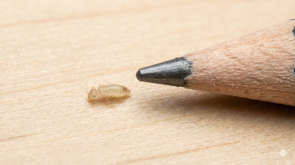 チャタテムシの幼虫(若虫)は、成虫とほぼ同じ形のまま小型で、色も薄く、透明っぽく見えることがあります。
