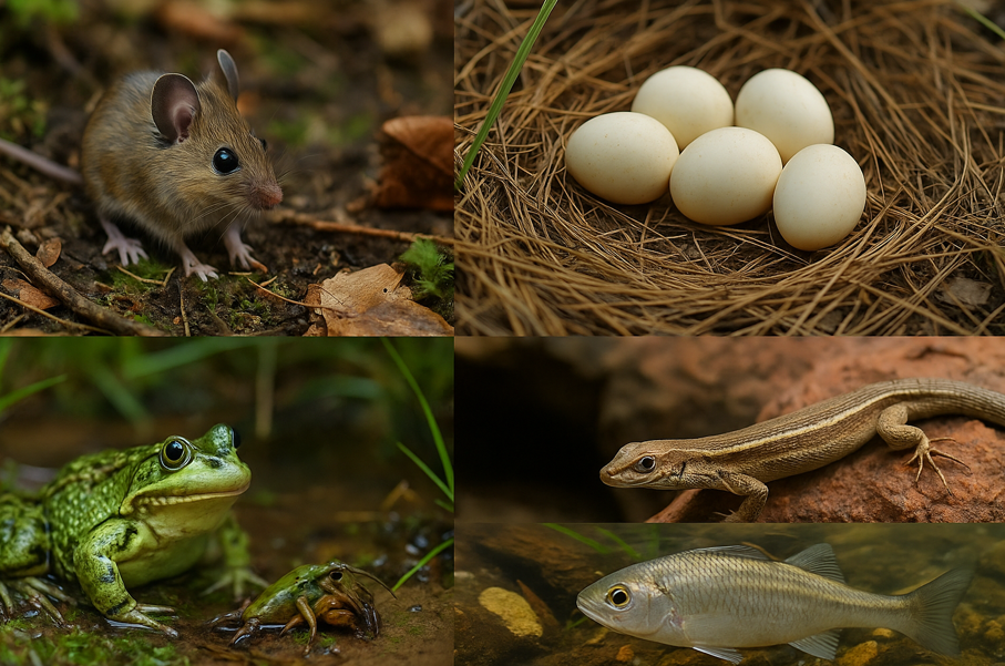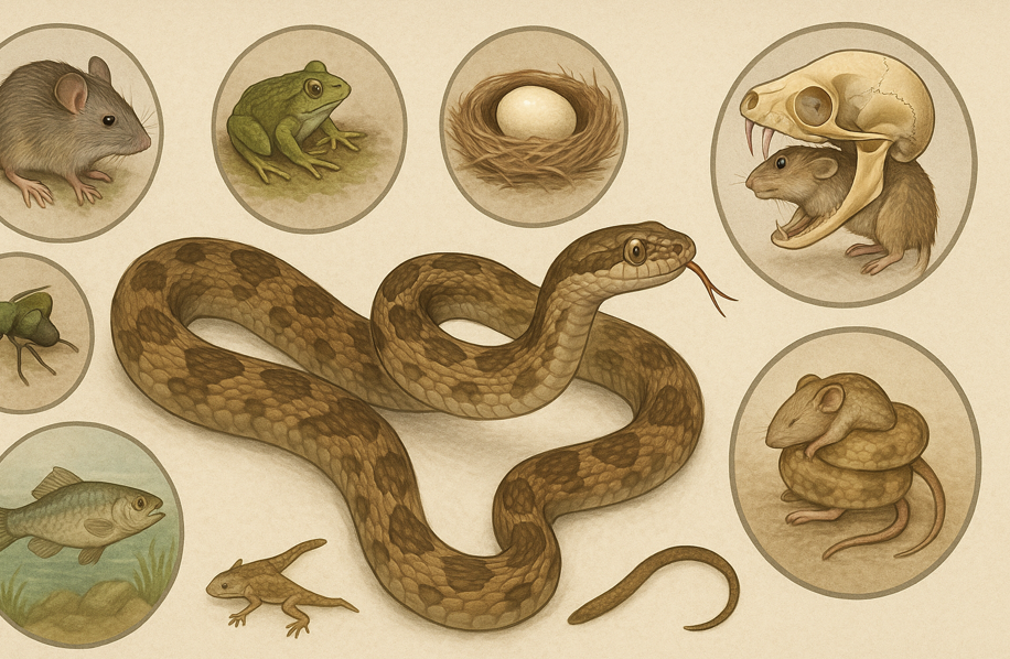 野外観察と飼育記録では、げっ歯類(ネズミ、ハツカネズミ)、鳥類とその卵、小型哺乳類(モグラやウサギの幼体など)、両生類(カエル、イモリ)、爬虫類(トカゲ、他のヘビを含む)、魚類、そして一部の小型種では昆虫や甲殻類まで、多様な動物を捕食対象にしています。