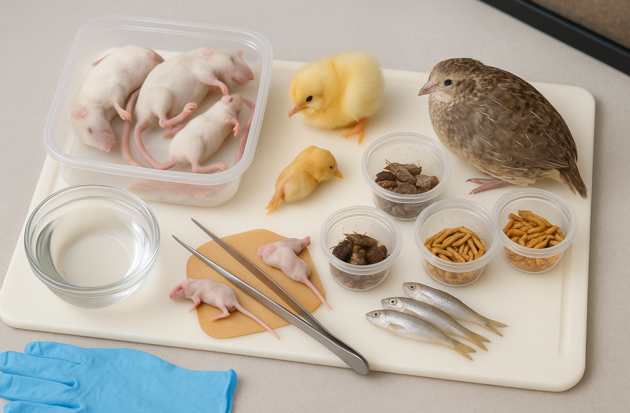 飼育環境下では、野生の食性を損なわない範囲で衛生と安全を両立させるため、凍結保存された実験級・飼料級のマウスやヒヨコ、ウズラなどが広く用いられます。