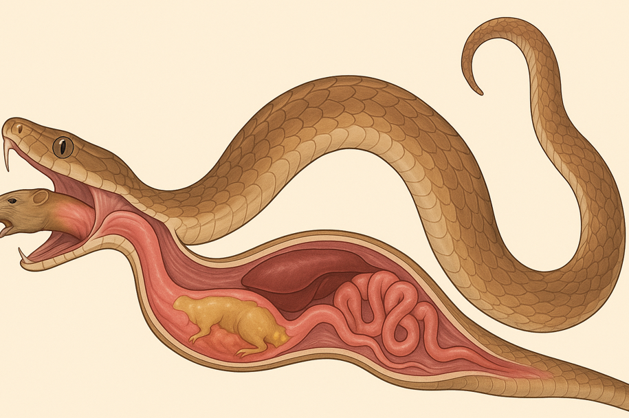 ヘビの消化器官は長い管状で、丸のみした獲物をゆっくりと消化します。