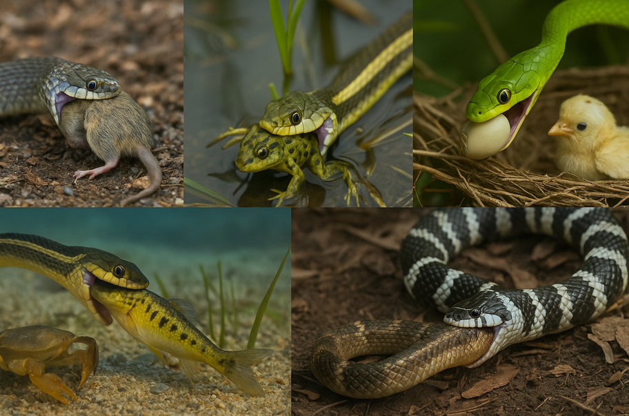 野外観察と飼育記録では、げっ歯類(ネズミ、ハツカネズミ)、鳥類とその卵、小型哺乳類(モグラやウサギの幼体など)、両生類(カエル、イモリ)、爬虫類(トカゲ、他のヘビを含む)、魚類、そして一部の小型種では昆虫や甲殻類まで、多様な動物を捕食対象にしています。