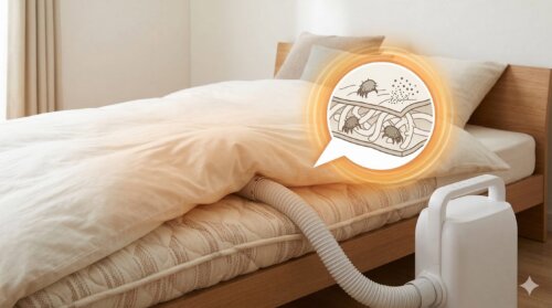 布団乾燥機は、自宅でできるダニ対策としてかなり有効です。なぜなら、ダニは高温と乾燥に弱く、寝具内部の環境を変えることで生息しにくくできるからです。毎日ダニに刺されるというYahoo!知恵袋の声では、「布団を天日干ししてもダメだった」「掃除機だけでは改善しない」といった悩みがよく見られますが、これは対策の方向が間違っているというより、熱を内部まで入れられていないことが原因になっている場合があります。