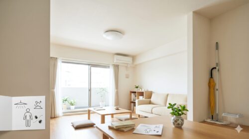 まずは、蜘蛛の主食となる微小害虫の温床を絶ちましょう。キッチン周りの生ゴミは蓋付きのゴミ箱に密閉し、食べかすが落ちやすいソファやカーペットはこまめに掃除機をかけます。また、湿気を好む虫を寄せ付けないよう、除湿機を活用して湿度を60%以下に保つのも効果的です。特に天井付近に虫が集まる原因の一つに、「光(紫外線)」があります。従来の蛍光灯は虫が好む紫外線を多く含みますが、LED照明は紫外線をほとんど出さないため、夜間に窓を伝って寄ってくる虫の数を劇的に減らすことができます。