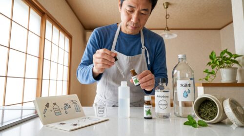 ハッカ油スプレーは、市販の材料で簡単に自作することが可能です。水にハッカ油を数滴垂らすだけでは油分が分離してしまうため、無水エタノールを媒介として均一に混ぜるのがポイントです。この天然の忌避剤を、蜘蛛の侵入経路や天井の隅に定期的にスプレーすることで、殺生することなく蜘蛛を追い出す「環境型防除」が可能になります。
