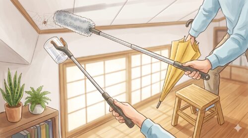 天井という高所での蜘蛛退治において、最大の障壁は「物理的な距離」です。無理をして椅子や脚立に乗って作業をしようとすると、蜘蛛がこちらへ落下してきた際に驚いてバランスを崩し、重大な転倒事故に繋がる危険性があります。安全を最優先にするならば、自らの体を高くするのではなく、道具のほうを「長く」するのが賢明な判断です。