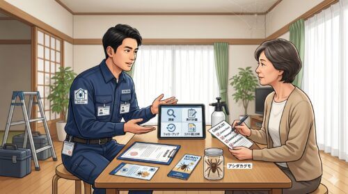 ここまで様々なDIY対策をご紹介してきましたが、どうしても自分の手には負えない状況というものも存在します。例えば、「吹き抜けの非常に高い天井に巨大な巣がいくつもある」「特定の蜘蛛が大量発生して精神的に限界」「セアカゴケグモのような有毒種の疑いがある」といったケースです。無理をして自分で対処しようとせず、プロフェッショナルである駆除業者の知見を借りることは、決して恥ずかしいことではなく、むしろ賢明なリスク管理です。