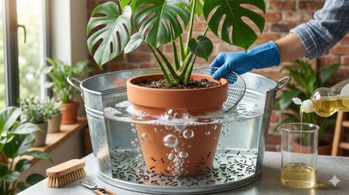 台所用の食器用洗剤を数滴混ぜた水は、表面張力が著しく低下しています。この水に鉢を丸ごと沈めると、水がアリの気門の奥深くまで瞬時に浸透し、逃げ場を完全に奪うことができます。この方法は、化学薬剤に耐性を持ったアリや、土の奥深くに潜む卵・幼虫に対しても一網打尽にできるという圧倒的なメリットがあります。