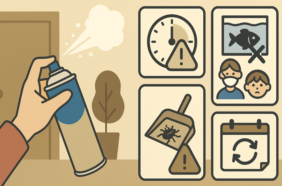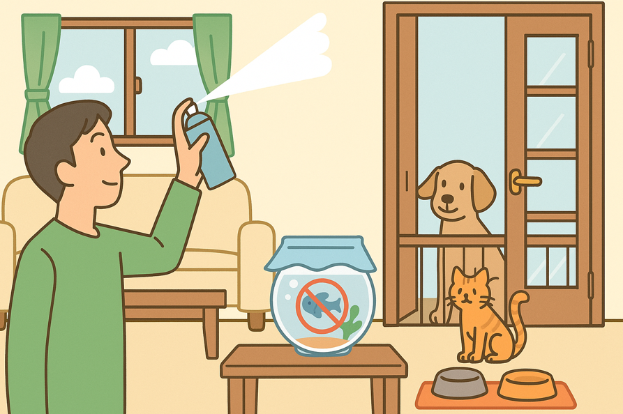 とくに、水生生物のいる住環境や、アレルギー・喘息持ちの家族がいる場合は、使用前に別室待機の段取りを取り、処理後に軽く換気してから戻る運用が安全側です。