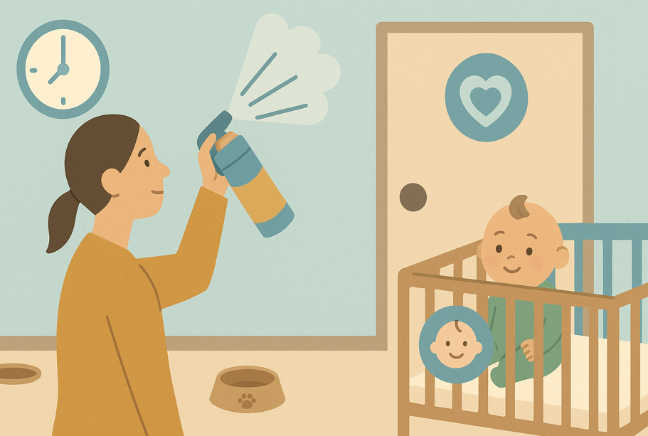 ペットの誤噴射や付着を避けるため、使用中は動物を退室させ、食器・おもちゃ・寝具はカバーするか片付けておきましょう。
