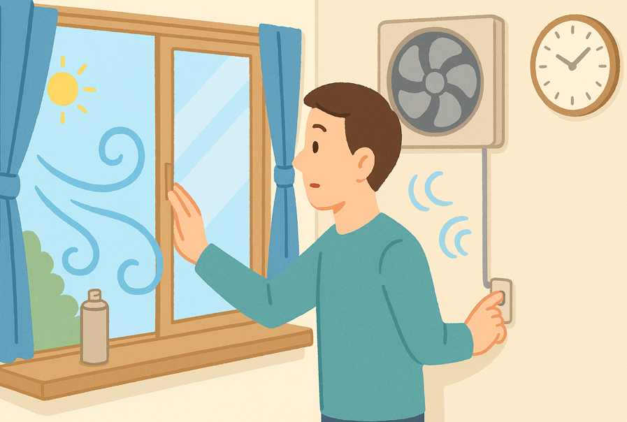 換気について明確な必須規定がない資料もありますが、ニオイが気になる場合や、敏感な家族・ペットがいる場合には、30分の閉め切り後に短時間の換気を行うと負担を下げられます。