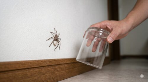 具体的な手順は以下の通りです: 壁に止まっているアシダカグモに対し、ゆっくりと、しかし迷わずに容器を上から被せます。この際、脚を挟まないように注意してください。 クモが容器の中でバタつきますが、落ち着いて壁と容器の隙間に厚紙をスライドさせながら差し込んでいきます。 厚紙で完全に蓋ができたら、容器と厚紙を一緒に壁から離します。これで捕獲完了です。 そのまま玄関や窓の外へ運び、厚紙を外してクモを逃がしてあげてください。