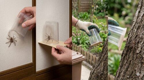 また、直接捕まえなくても「追い出す」ことも可能です。クモは空気の振動や音に非常に敏感です。クモが進んでほしい方向とは「逆側」の壁をトントンと叩いたり、丸めた新聞紙で壁を叩いて音を出したりすると、彼らは驚いて反対方向へ逃げていきます。窓を開けておき、そこへ誘導するように追い込めば、一切触れずに退治(追放)が完了します。この方法は、特に卵嚢を持っていない個体に対して非常に有効で人道的です。