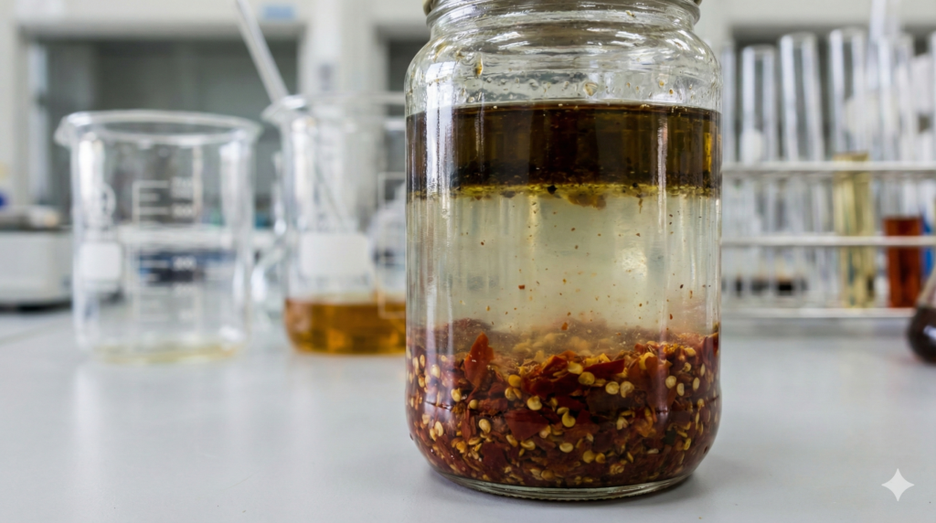 唐辛子をそのまま刻んだだけでは、繊維や種、皮などが混ざった「ペースト」ができるだけで、狙った濃度の有効成分を、安定した形で取り出すことはできません。