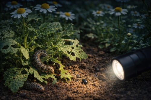 「朝起きたらカモミールの葉が丸坊主になっていた」「蕾が根こそぎ消えている」――そんな衝撃的な被害をもたらすのがヨトウムシ(夜盗虫)です。その正体はヨトウガという蛾の幼虫で、その名の通り昼間は土の中や株元の影に潜み、夜の闇に乗じて活動を開始する「夜の破壊神」です。
