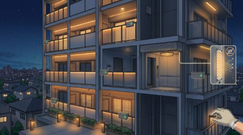 ・帰宅時、ドアを開ける前に肩や背中を軽く手で払う。 ・共用廊下のライトが古いタイプ(蛍光灯)で虫が集まっている場合は、管理会社にLED化を相談する。 ・ベランダに洗濯物を干している場合は、取り込む際によく振って、虫が付いていないか確認する。
