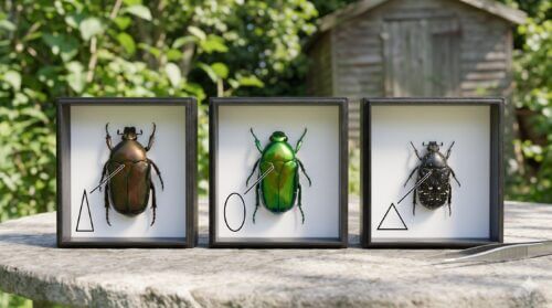 これに対し、コガネムシの小楯板は半円形または鈍角な楕円形を呈しており、全体的に丸みを帯びたフォルムを持ちます。また、頭部の形状も異なります。カナブンは四角形に近い直線的な構造をしていますが、コガネムシは全体的にドーム状で丸みを帯びています。