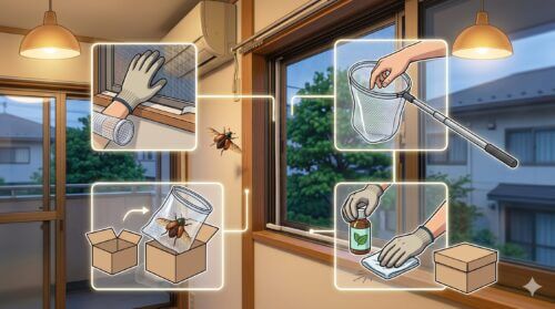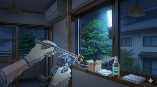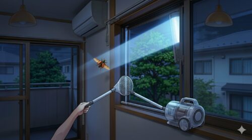 この方法は、室内を薬剤で汚すこともなく、大きな羽音に怯える時間も最小限に抑えられます。無理に捕まえようとして部屋の中を滅茶滅茶にする前に、まずは「光の道」を作ってあげてください。これが、プロが実践する最もストレスの少ない退治方法です。