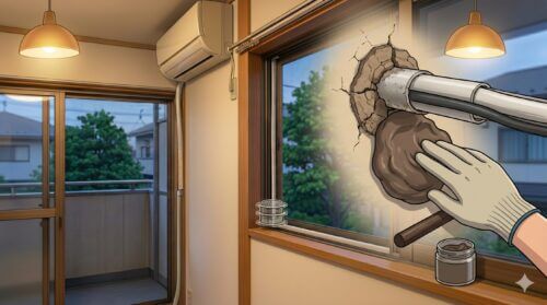 エアコン関連でもう一つ見落とせないのが、壁を貫通している「配管穴(スリーブ穴)」の隙間です。エアコンの配管は、室内機から室外機へと壁の穴を通って繋がっていますが、この穴の隙間を埋めるために使われているのが「エアコンパテ」です。このパテは施工直後は粘土のように柔らかく密着していますが、数年が経過すると経年劣化によって乾燥し、カチカチに硬化してしまいます。すると、壁とパテの間に数ミリの隙間が生じ、そこがカナブンの侵入ゲートウェイとなるのです。