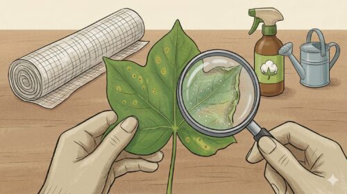 なお、ハダニの初期症状の拾い方としては、ハダニ被害の見分け方の考え方も応用しやすいです。綿花でも、白い点が出た段階で葉裏を見る習慣をつけるだけで、被害の広がり方は大きく変わります。結局のところ、綿花の害虫対策で一番効くのは、毎回同じ順番で観察し、小さな異変を見逃さないことです。そこに物理防除、予防管理、必要に応じた薬剤選びを重ねていけば、綿花は十分に守れます。