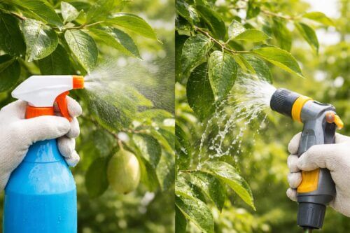 ハダニ対策では、葉水と水洗いを軽く見ないでください。家庭で最初にやるべき対策として、葉裏を中心にしっかり水で落とす方法は実用性が高く、被害の初期段階なら密度を下げるうえで役立ちます。ナツメのように葉が茂りやすい木では、表面だけをぬらしても十分ではなく、葉裏、新芽の付け根、込み合った部分へ水を届かせる意識が必要です。私は、葉水を単なる乾燥対策ではなく、観察を兼ねた管理だと考えています。水を当てながら葉裏を確認すれば、白いかすれ、糸、粒状の動くものといったサインを同時に拾えるからです。