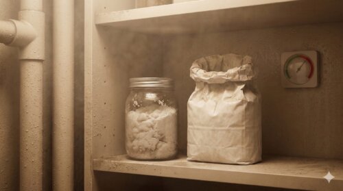 また、ダニ対策は塩だけで完結しません。周辺の粉物、棚の汚れ、空気のこもり、調味料口のベタつきまで含めて管理すると、再発を大きく減らせます。とくに、塩の近くにある小麦粉や片栗粉、だし類、ミックス粉などは、同時に保存方法を見直したほうが効果的です。塩だけを気にしても、周囲が高温多湿で粉が飛び散っている状態では、安心しきれません。
