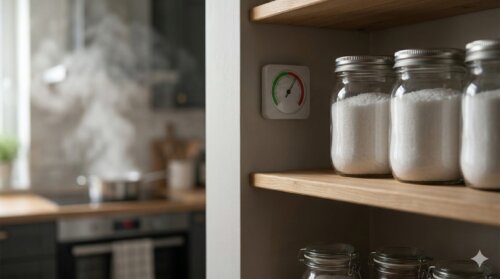 また、コナダニ対策では湿度の管理がとても重要です。温度は季節で変えにくくても、湿度は収納場所の選び方や換気、容器の密閉性である程度コントロールできます。たとえば、調味料棚に物を詰め込みすぎると空気が流れず、湿気がこもりやすくなります。調理後にすぐ戸棚を閉めてしまう、濡れた布で拭いたあと乾かしきらないまま容器を戻す、といった行動も小さな積み重ねでリスクになります。