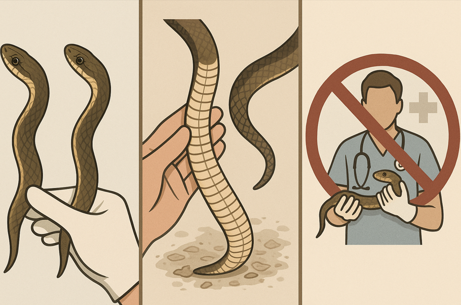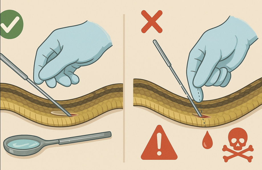 幼蛇でのポッピングは一見簡単に見えますが、圧の角度と強さ、指の支点位置を誤ると容易に外傷を招くため、未経験者の実施は厳禁です。