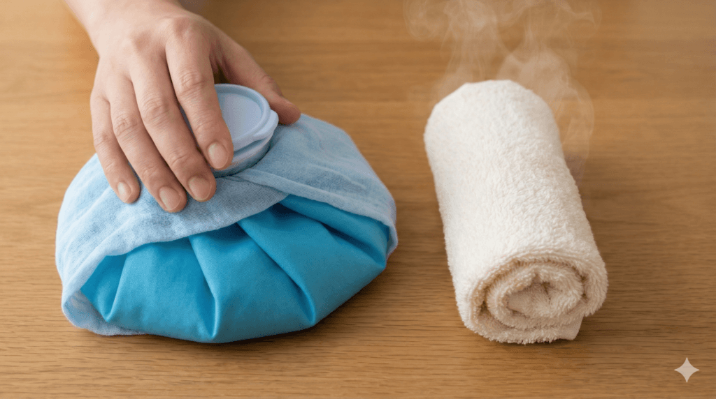 保冷剤や氷を使う場合は、凍傷を避けるために布で包み、短時間で様子を見るのが無難です。