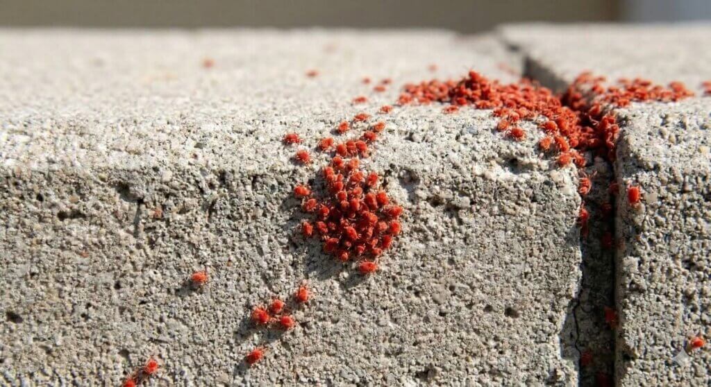 コンクリートで赤いダニ集合体が目立つのは、表面が一見なめらかでも、実際には細かな凹凸やすき間があり、花粉や微細な有機物がたまりやすいからです。そこに春の日差しが当たり、タカラダニにとって動きやすい環境ができると、外壁や床面に群れて見えます。コンクリートは乾きやすく、熱を持ちやすく、しかも細かい汚れが残りやすい素材です。この条件が、春先の赤いダニと相性がよいわけです。
