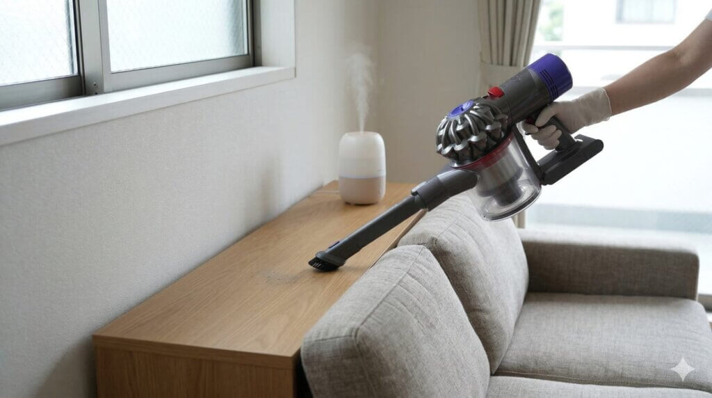 また、掃除機がけは一度強くかければ終わりではありません。繊維のある場所は方向を変えて複数回、棚の角はノズルを変えて、布団は表面だけでなく縫い目や端も意識して行うと差が出ます。短時間でザーッとかけるだけでは、表面のホコリしか取れないことが多いです。ダニ対策の掃除は「速さ」より「丁寧さ」です。