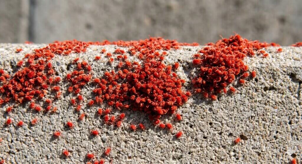 ベランダや外壁、コンクリート面に出る赤いダニ集合体は、タカラダニの可能性が高いです。春から初夏にかけて日当たりのよい場所で目立ちやすく、動きが速く、細かい赤い点が散るように見えるのが特徴です。