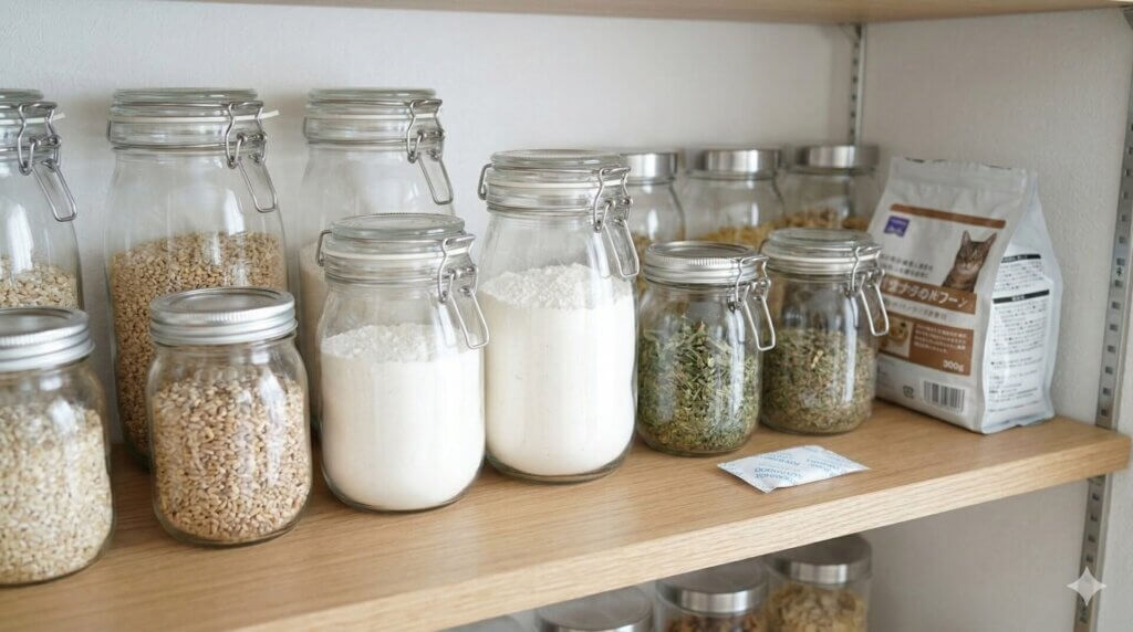 対策はシンプルで、まず疑わしい食品を密封して隔離し、棚を空にして拭き掃除し、十分に乾燥させます。そのうえで、今後は開封後の食品を密閉容器に移し、長期保管を避けることが大切です。特に梅雨時期や夏場は、見た目以上に湿度の影響を受けます。紙袋のまま保管している、小分け袋の口をしっかり閉めていない、シンクや加湿器の近くに食品棚がある、といった条件があると再発リスクが上がります。