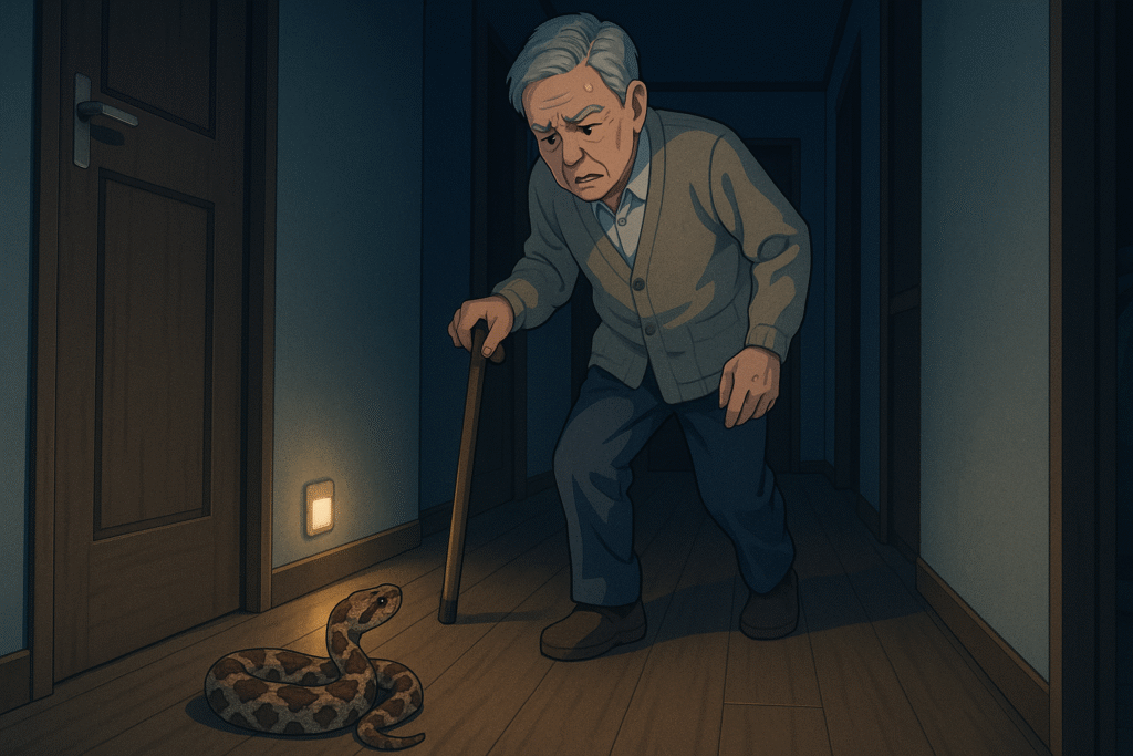 家の中でマムシに咬まれたとき、若い人であればすぐに移動して119番通報や救急外来への搬送がスムーズに進む場面でも、高齢者の場合は「痛みで立てない」「玄関まで移動するだけで時間がかかる」といった状況になりがちです。