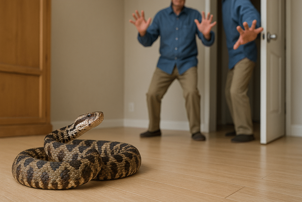 家の中でマムシを見つけた瞬間、一番大事なのは「近づかない・追い詰めない・触らない」の三原則です。