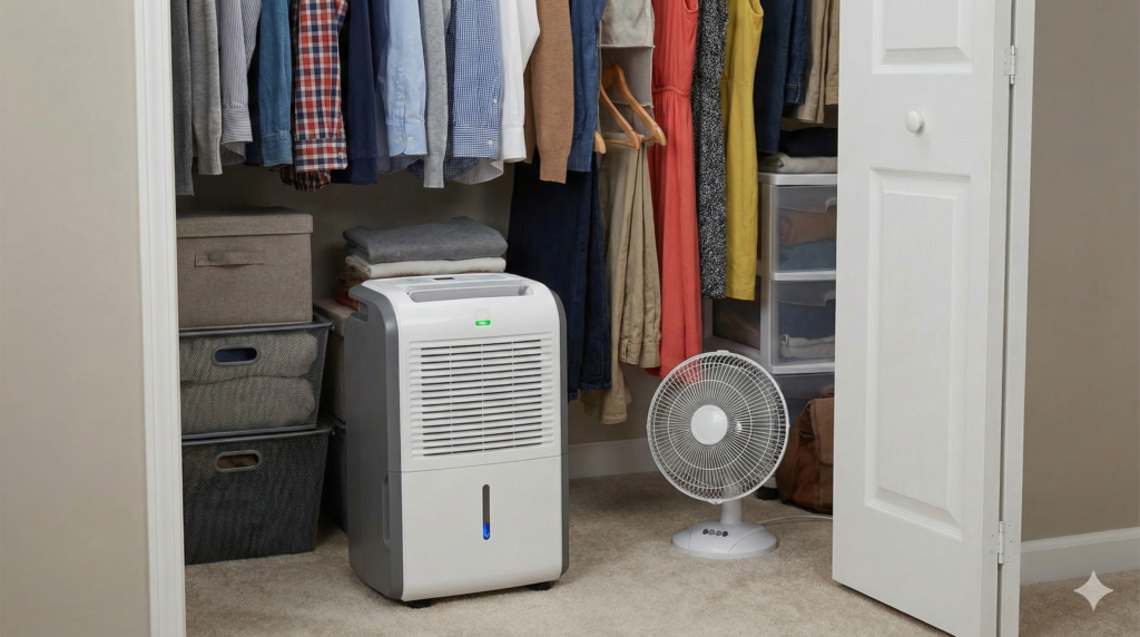 おすすめは、扉を開けた状態でサーキュレーターの風を弱く当てること。さらに、収納物を壁から少し離して隙間を作るだけでも変わります。