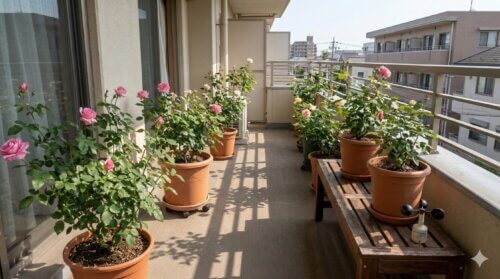 バラは日照を好む植物ですが、真夏のベランダでは、日当たりが良いことと環境が快適であることが一致しない場合があります。照り返しが強い床、コンクリート壁の反射熱、室外機の排気が重なると、株は想像以上に消耗します。