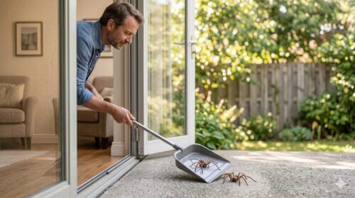 - 蜘蛛の進行方向に、ちりとりをそっと置きます。