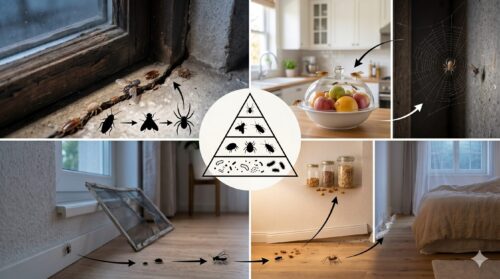家の中に蜘蛛が現れる最大の動機は、生存のための狩りです。特に夏場など、光に集まった羽虫や、ゴミの臭いに引き寄せられたハエが室内に増えると、それを察知した蜘蛛が侵入してきます。つまり、蜘蛛対策とは「蜘蛛だけを見ること」ではなく、「家の中の衛生状態を整え、他の害虫をゼロに近づけること」とイコールなのです。家の中に餌が全くなければ、蜘蛛はわざわざ危険を冒して人間に見つかる場所には留まりません。