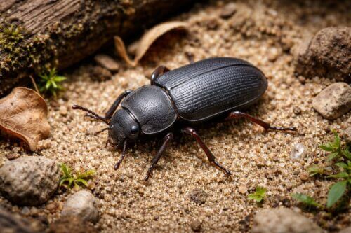 スナゴミムシダマシは、黒色から暗褐色の小型甲虫で、体つきはやや扁平、全体にがっしりした印象があります。歩き方は比較的ゆっくりで、地表や乾いた場所を這うように移動するのが特徴です。夜に活動しやすく、日中は石の下、落ち葉の陰、資材のすき間、乾いた土の表面近くなどに潜んでいることが少なくありません。