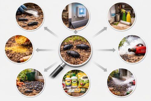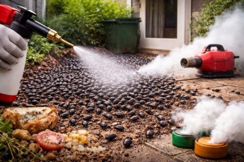 次に、発生源の撤去・清掃・隔離を先に行い、そのうえで残った個体を減らします。屋外では不要物の整理と地表環境の見直し、室内では汚染食品の廃棄や保存方法の変更が重要です。大量発生時ほど、見えている虫より見えていない発生源の処理が本丸になります。