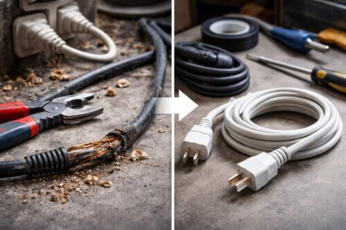 家電本体からコードが分離できるなら、適合する純正部品やメーカー指定品への交換が基本です。本体一体型のコードや壁内配線に被害が及んでいるなら、個人判断で触らず、専門業者の点検を受けるのが安全です。とくに延長コードやテーブルタップは、外側の被覆だけでなく差し込みプラグや根元の曲がり部分に負荷が集中しやすいため、噛み跡がある時点で全体交換を前提にしたほうが無難です。
