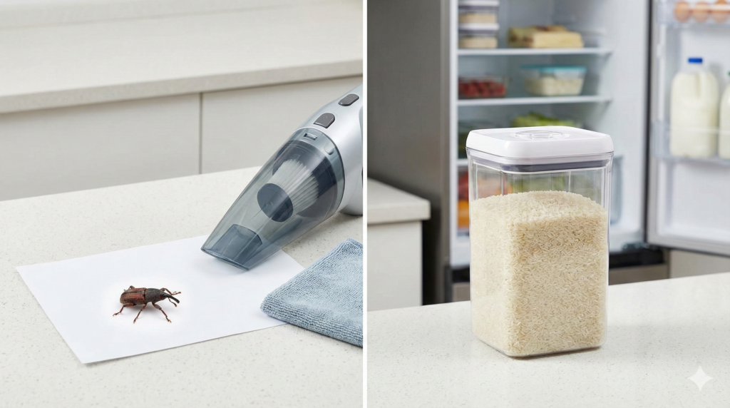 冷凍で時間差の羽化を止め、米びつ周りの温床を掃除で消し、保存を冷蔵へ寄せます。