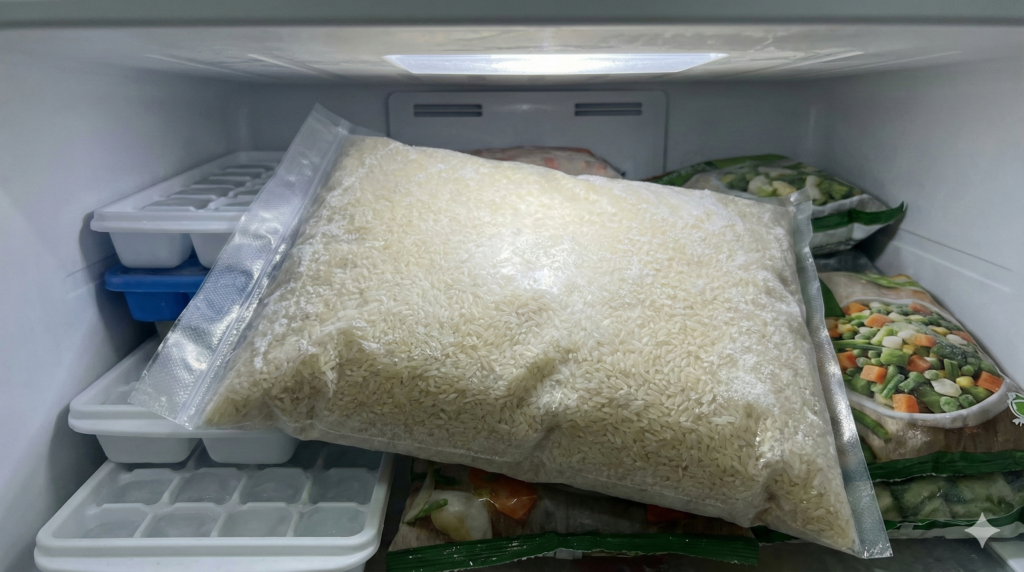 手順はシンプルです。米を密閉袋や密閉容器に移し、空気をなるべく抜いて冷凍庫へ入れます。