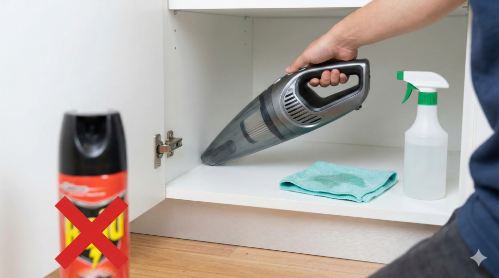 台所や米びつ周りで一匹だけ見つけた時、つい殺虫剤に手が伸びますが、食品周りは慎重に。ポイントは発生源を断つ掃除です。