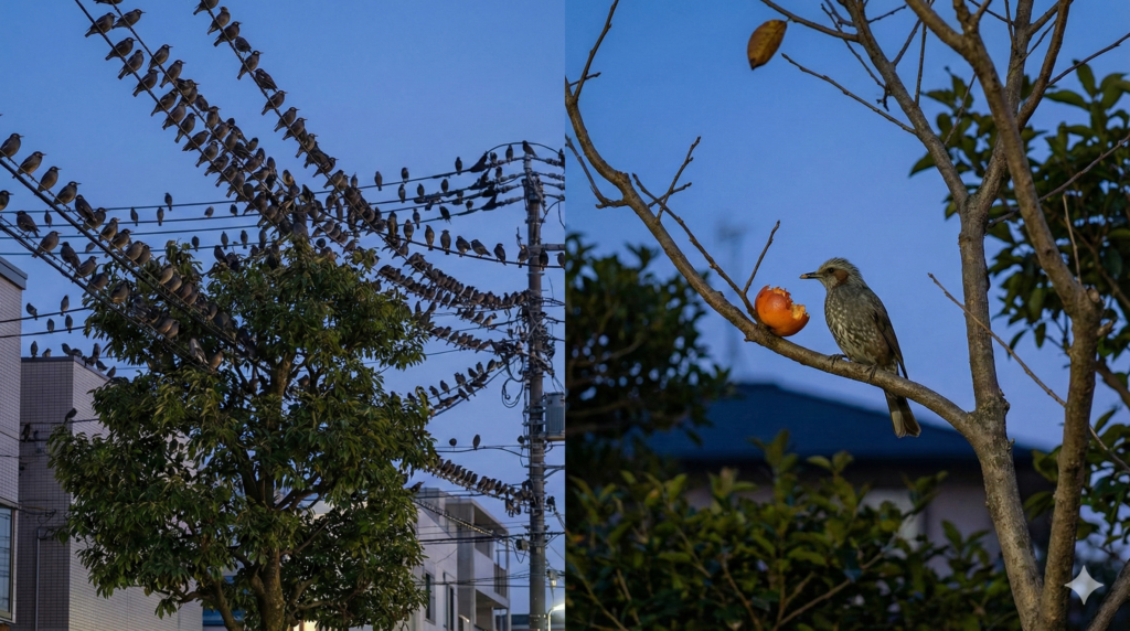 果樹・花木の被害ならヒヨドリ寄り、駅前や街路樹での騒音・糞害ならムクドリ寄り。家の隙間に入りそうなら、早めに点検して封鎖を検討してください。