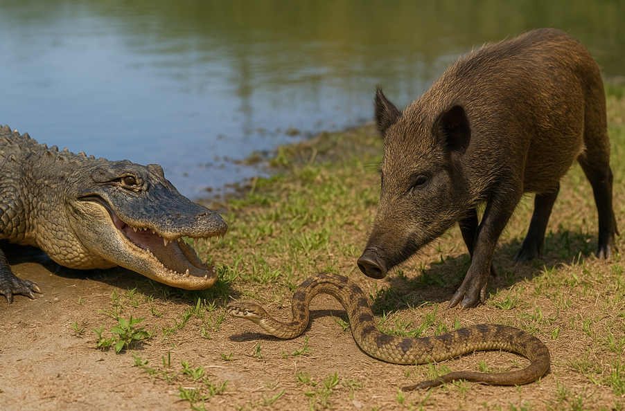 熱帯域や亜熱帯の湿地では、ワニ類が水際で待ち伏せし、水に入ったヘビを一撃で捕らえます。
