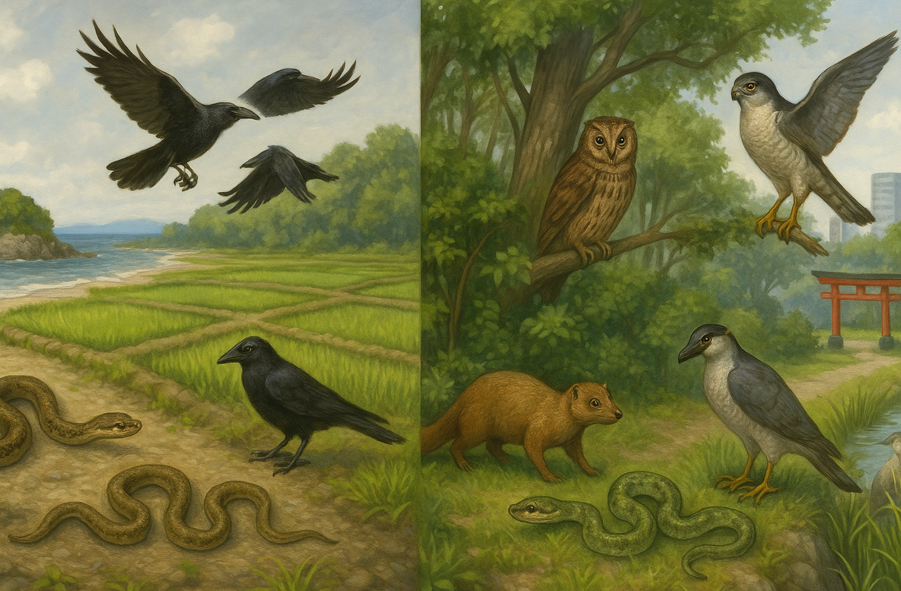 日本でヘビへ継続的な捕食圧を与える主な相手は、猛禽類、カラス類、中型哺乳類です。これらは地域・季節・時間帯によって優占が入れ替わり、幼体期ほど影響が大きくなります。