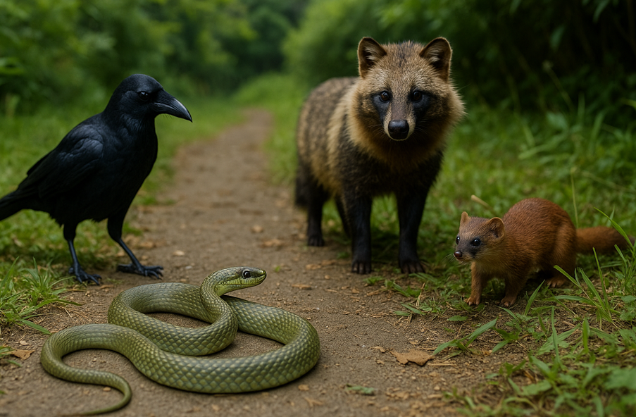 タヌキも機会捕食者として幼蛇や弱った個体を食べることがあり、地域の個体群に一定の圧力をかけます。