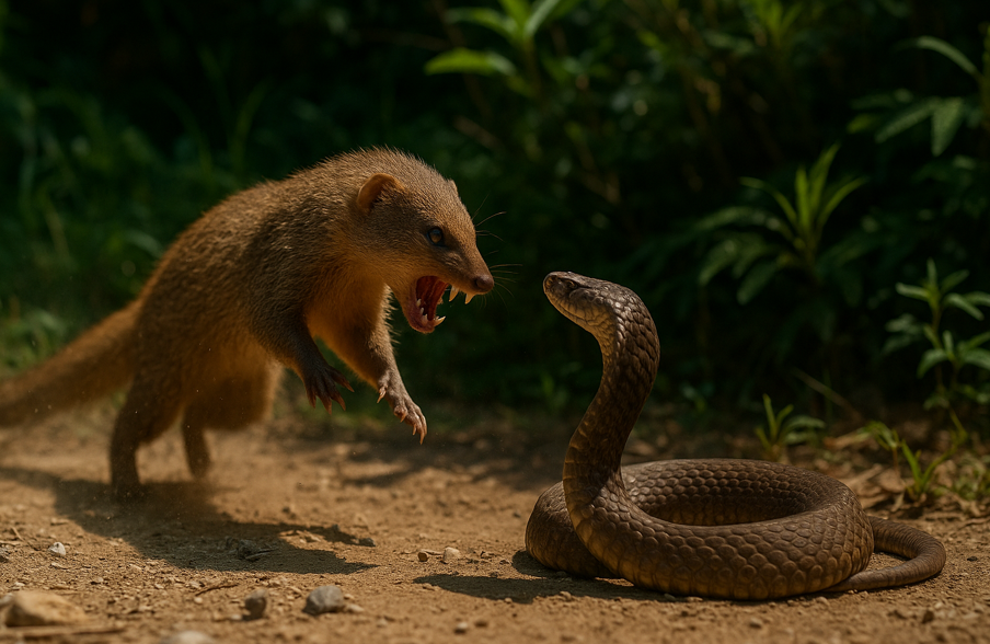 マングースは俊敏な動きと鋭い咬合でヘビの頭部を狙い、短時間で致命傷を与えることで知られます。