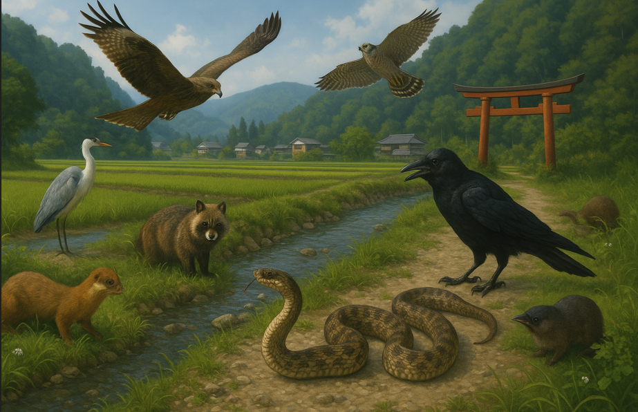 都市域ではカラスとトビの監視圧、里山ではフクロウとタヌキ、河川・湖沼周辺ではサギ類が相対的に目立ちます。